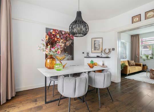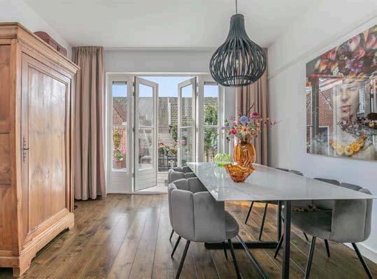 In de woonkamer en suite kun je op sfeervolle wijze een comfortabele zithoek en een gezellig eetgedeelte plaatsen. Ook in deze ruimte komt dezelfde vloer terug en de wanden zijn verzorgd afgewerkt. Het daglicht valt optimaal naar binnen via het grote raam met glas-in-lood details aan de voorzijde. En de openslaande tuindeuren aan de achterzijde zorgen voor een verbinding tussen binnen en buiten.
