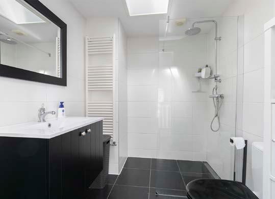 Op de eerste verdieping is de nette badkamer gelegen. De ruimte is volledig betegeld en ingericht met een douche met glazen scherm, badkamermeubel en een toilet. Via de lichtkoepel valt het licht aangenaam naar binnen.