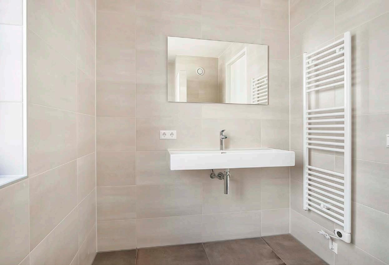De riante badkamer is netjes betegeld van grond tot plafond in een moderne kleurstelling. Je kan hier heerlijk ontspannen na een drukke dag. De ruimte is voorzien van vloerverwarming, een toilet, inloopdouche, wastafelmeubel en design radiator. De badkamer biedt alle comfort en luxe die je wenst.