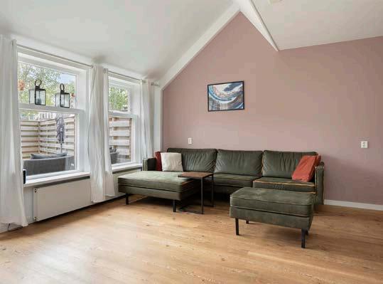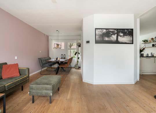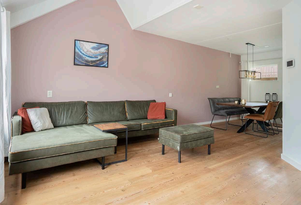 De woonkamer profiteert van veel natuurlijk lichtinval dankzij de grote ramen aan beide zijden van de ruimte. De vloer is bedekt met grenen hout, de wanden zijn strak gestuct en het plafond aan de tuinzijde is extra hoog. Vanuit de woonkamer heb je toegang tot de tuin.