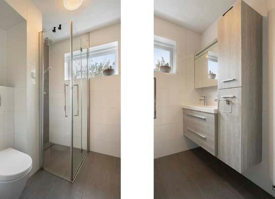 De luxe badkamer is prachtig afgewerkt met grijze en witte tegels. Deze is voorzien van een douche, wastafelmeubel, designradiator en een tweede toilet met hangend closet.