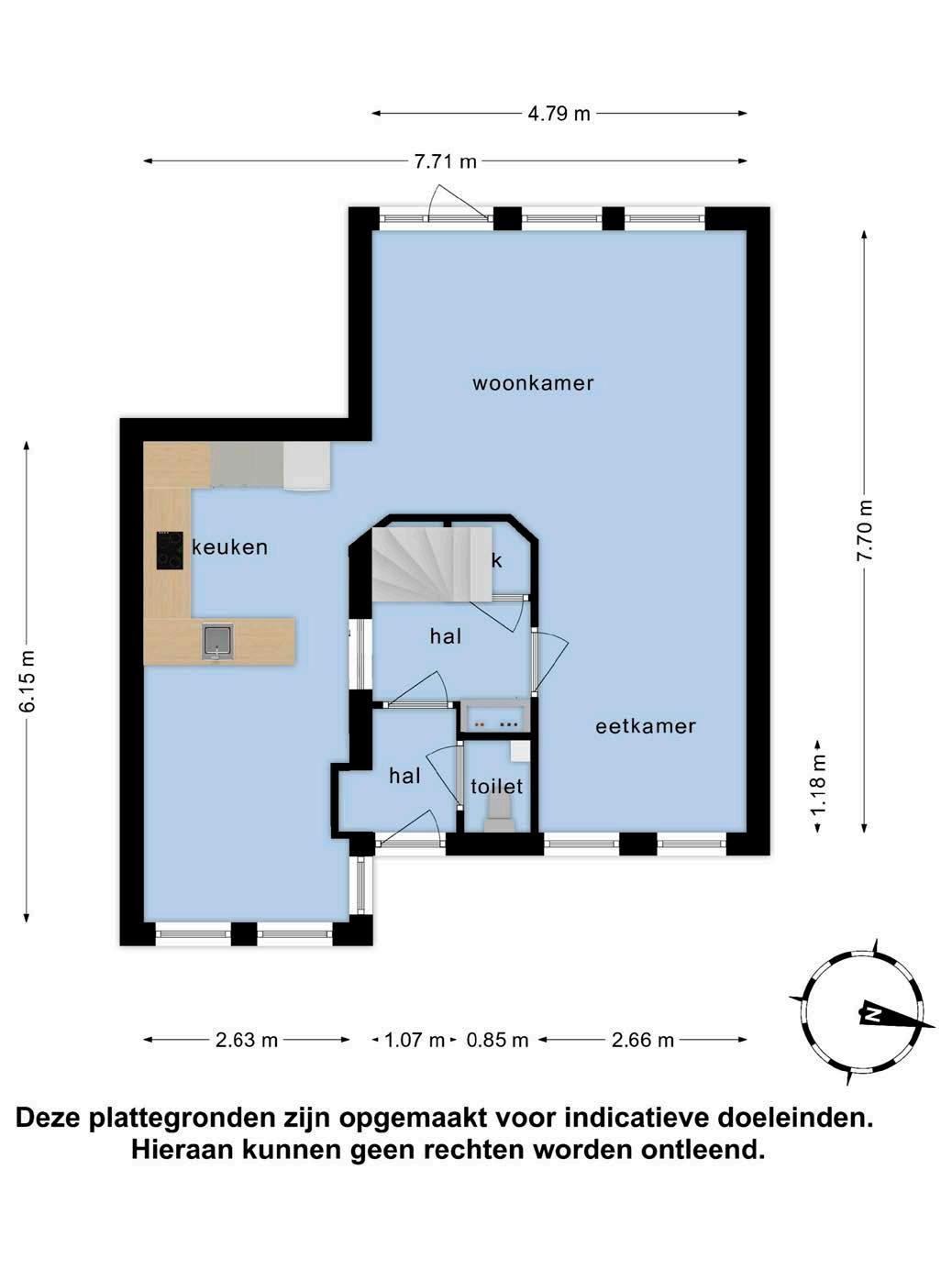 Je komt de woning binnen in het voorportaal met toilet voorzien van hangcloset. Vanuit hier kom je in de hal met de meterkast, een trapopgang en toegang tot de woonkamer en keuken.