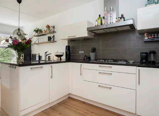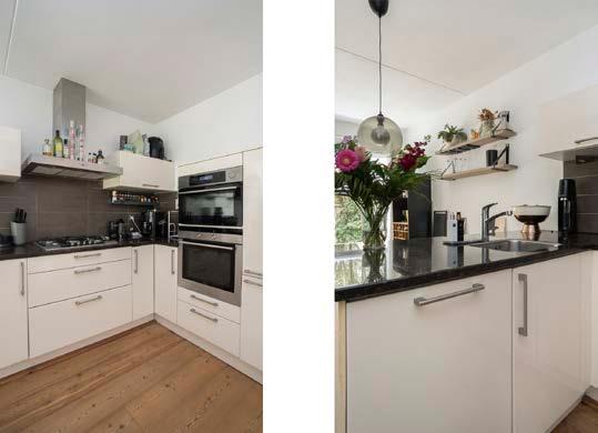De U-vormige woonkeuken is voorzien van een granieten aanrechtblad, een 5-pits gasfornuis, een afzuigkap, een nieuwe vaatwasser, een combi-oven en een heteluchtoven. De keuken is compleet met een apothekerskast en een boiler voor direct warm water. Bij het raam aan de straatzijde is voldoende ruimte voor een eettafel en stoelen.