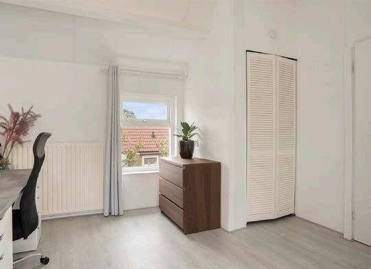 Via een vaste trap is de tweede verdieping bereikbaar. Hier vind je de vierde slaapkamer, met een oppervlakte van 13m2. Deze kamer is voorzien van een laminaatvloer en vaste kasten met aansluiting voor de wasmachine en de CV-installatie.
