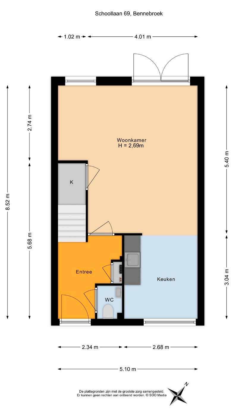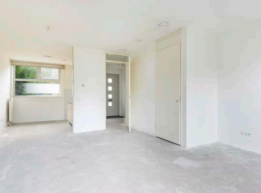 Via de voortuin betreed je de entree van de woning met de hal, toilet, meterkast en toegang tot de woonkamer. De doorzonwoonkamer zegt het al: veel (zon)licht in deze living voorzien van openslaan de deuren naar de achtertuin. De halfopen keuken is nu nog basic, maar ook daar kun jij je fantasie op loslaten en er jouw droomkeuken inzetten.