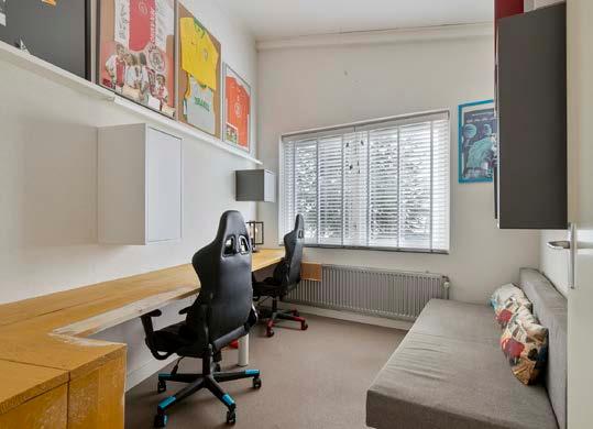 Via de rechte trap bereik je de eerste verdieping, waar de overloop aangenaam verlicht is door een dakraam. Dit creëert een gevoel van openheid en maakt de overloop een prettige doorgang. Hier vind je een kleine vliering voor koffers en toegang tot drie ruime slaapkamers, een badkamer, een apart toilet en een kast met de CV-ketel. De slaapkamers bieden flexibele indelingsmogelijkheden en de gehele verdieping heeft een stijlvolle grindvloer. De ruime slaapkamer aan de achterzijde strekt zich uit over de volle breedte van de woning en geeft toegang tot twee extra kamers boven de garage, momenteel ingericht als walk-in closet met wasmachine aansluiting. De badkamer, met een moderne inloopdouche en dubbele wastafel, profiteert van natuurlijk licht dankzij een Solar tube.