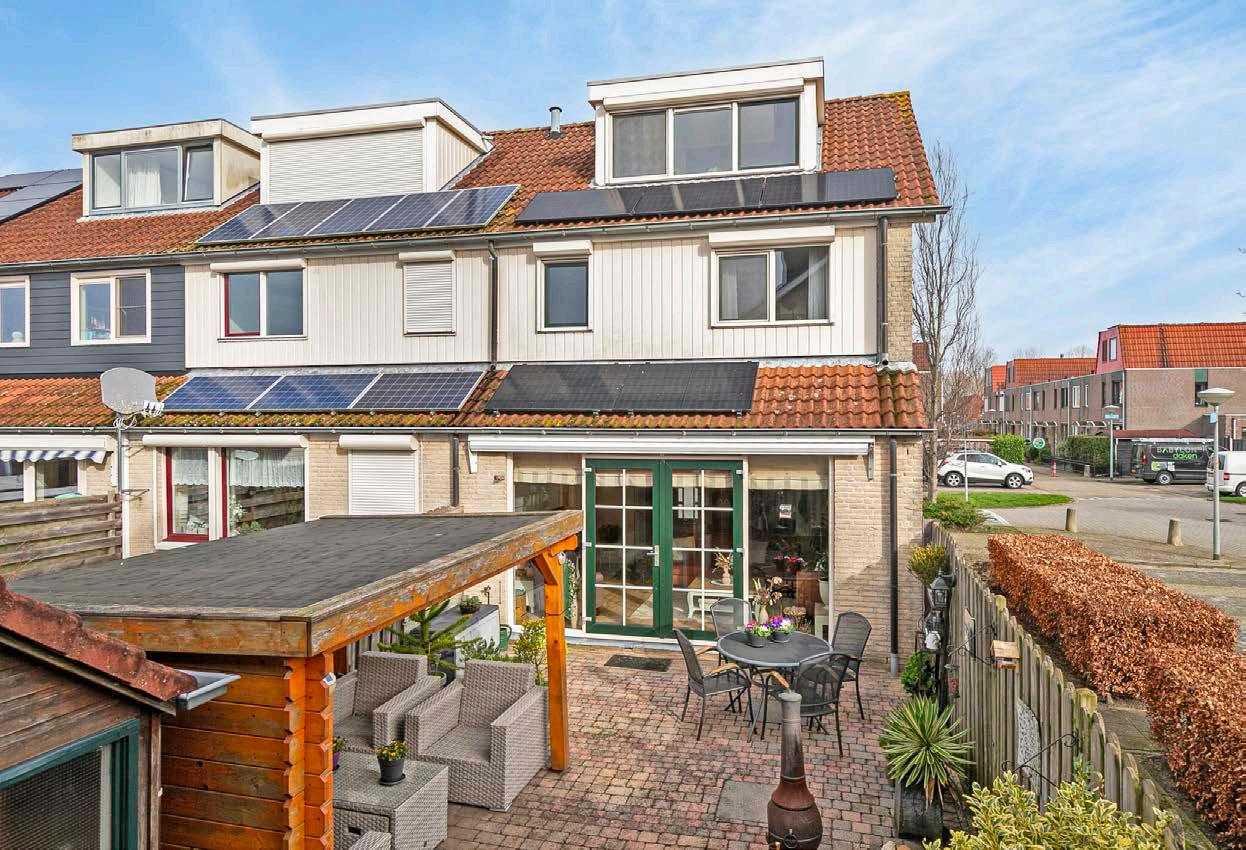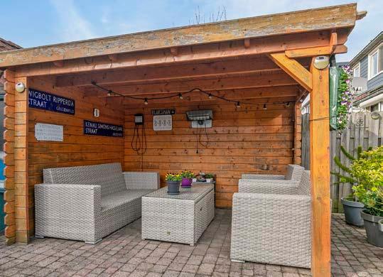In de voortuin geniet je van de ochtendzon, terwijl de achtertuin op het westen je uitnodigt om tot in de late uurtjes van de zon te genieten. De tuin is onderhoudsarm dankzij de bestrating en biedt een vrijstaande berging voor al je tuinspullen. Onder de veranda zit je lekker beschut op de warme dagen. De achterom maakt het gemakkelijk om fietsen en ander groot speelgoed in en uit te brengen. Hier vier je de zomeravonden en geniet je van de rust van je eigen buitenruimte.