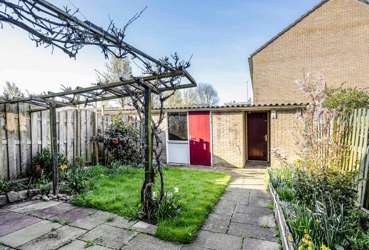 De keuken verleent toegang tot de achtertuin op het zuidwesten. Ook hier is liefde en aandacht vereist, maar is qua ligging en afmeting erg prettig. Deze buitenruimte zal straks een van de favoriete plekjes worden waar je op mooi-weer-dagen een groot deel van de tijd zult doorbrengen. Een comfortabele tuin- of loungeset met een goede kop koffie, zie jij jezelf hier al zitten?