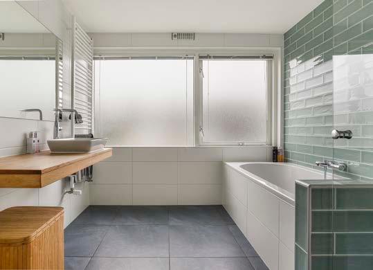 De badkamer die zich eveneens aan de achterzijde bevindt, is grotendeels betegeld en maakt daarmee een moderne en verzorgde indruk. De indeling bestaat uit een wastafelmeubel, ligbad, inloopdouche en een toilet. Aan de voorzijde vind je nog een aparte wasruimte.