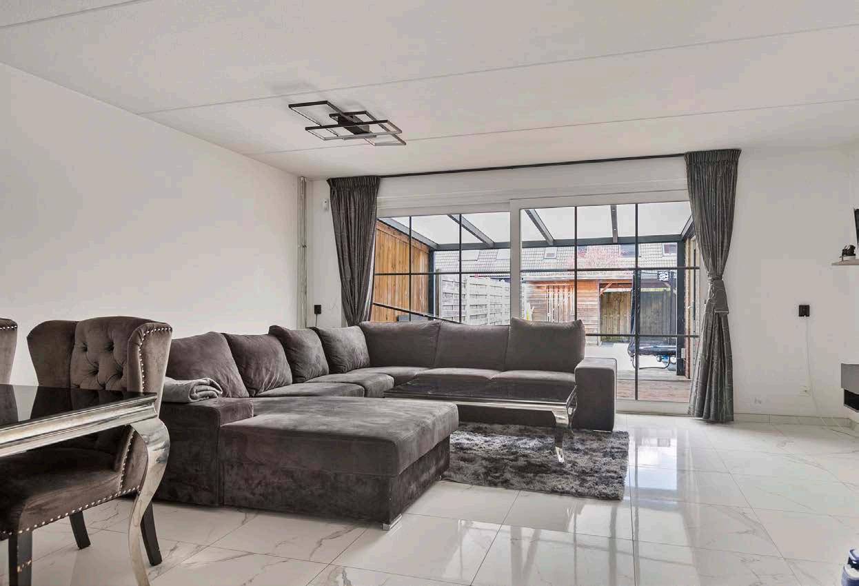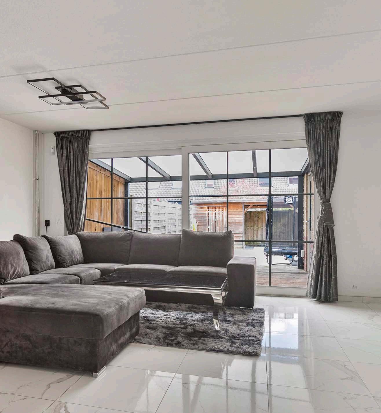 De woonkamer is het kloppende hart van deze woning, waar ruimte en licht samensmelten tot een harmonieus geheel. De grote schuifpui biedt niet alleen een prachtig uitzicht op de tuin, maar zorgt ook voor een overvloed aan natuurlijk licht. Het is de ideale plek voor gezellige familieavonden of een rustige middag met een goed boek. De vloerverwarming zorgt voor een constante, aangename temperatuur, wat deze ruimte tot de favoriete plek van het huis maakt.