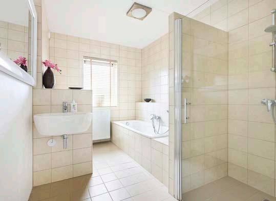 De badkamer is aan de achterzijde gesitueerd. Het geheel is van grond tot plafond betegeld en heeft een verzorgde uitstraling. De indeling bestaat uit een toilet, wastafel, douche en een ligbad. Spoel de dag van je af!
