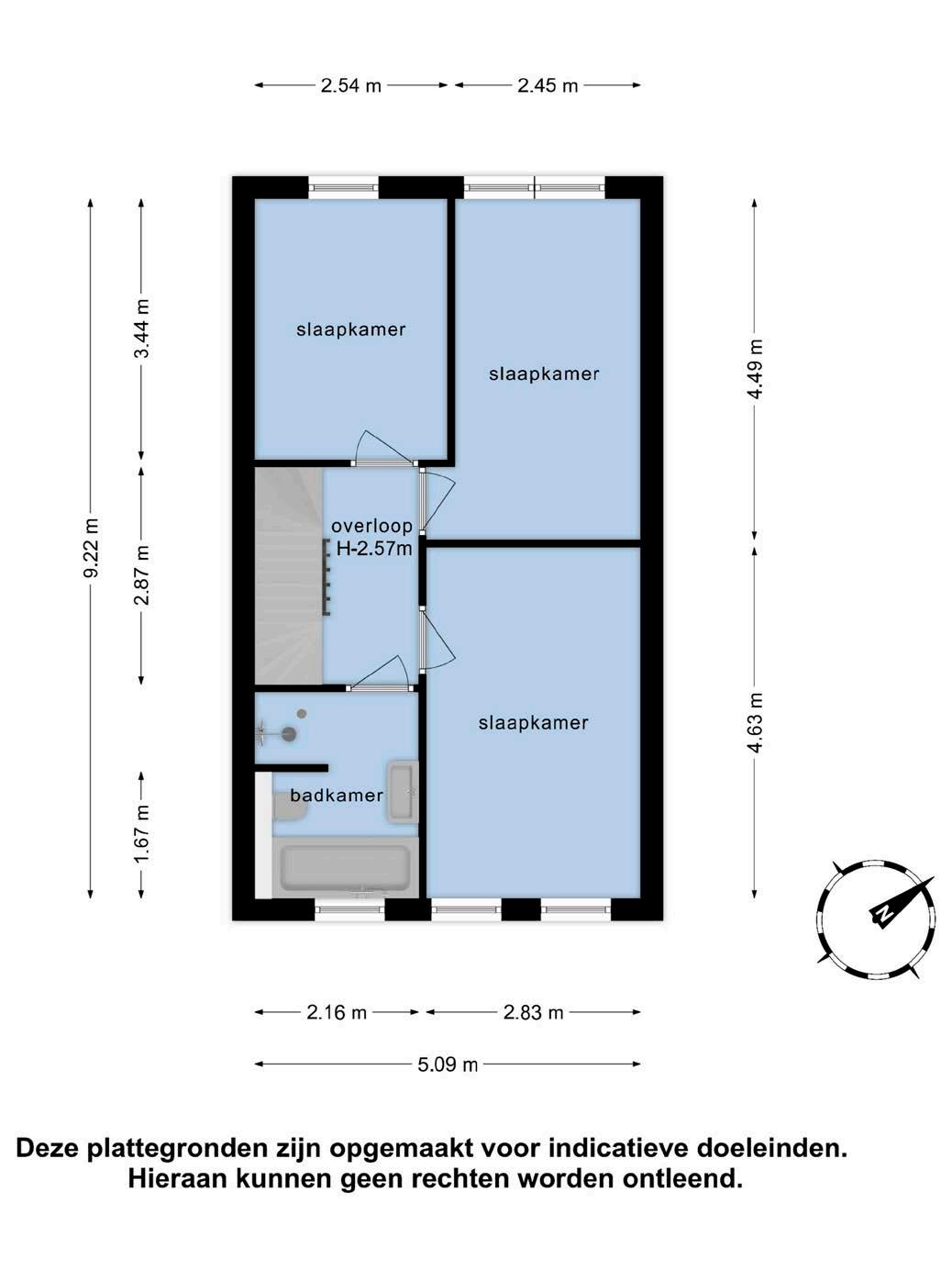 Op de eerste verdieping vind je drie slaapkamers, elk met genoeg ruimte voor een bed, bureau en kledingkast. De badkamer beschikt over een ligbad, douchecabine, dubbel wastafelmeubel en toilet. Het raam zorgt voor natuurlijk licht en frisse lucht.