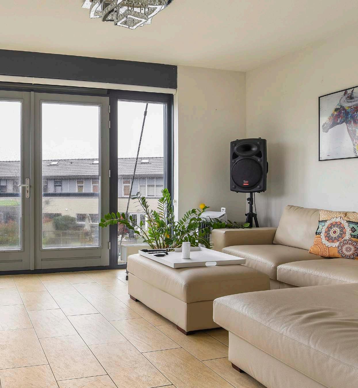 De woonkamer is keurig netjes afgewerkt met een plavuizen vloer en lichte kleuren op de wanden, waardoor je hier met verschillende interieurstijlen uit de voeten kunt. De vele ramen en het Frans balkon zorgen voor een aangename inval van daglicht en een fraai zicht op het water.