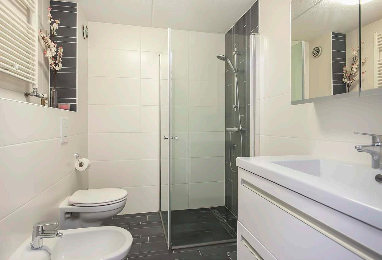 De badkamer is van grond tot plafond betegeld in lichte kleurstelling en oogt hiermee ruim en verzorgd. Daarnaast is de ruimte ingedeeld met een douche, wastafel, toilet en bidet.