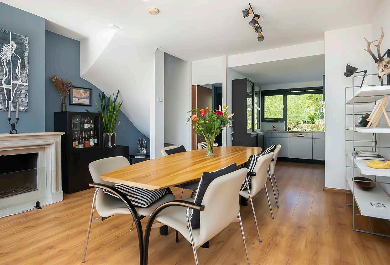 Vanuit de woonkamer heb je toegang tot de open keuken met ruimte voor een gezellige eethoek. De keuken is netjes en voorzien van een L-opstelling, maar indien gewenst kun je deze nog moderniseren naar jouw eigen smaak. Dankzij het raam in de keuken heb je een mooi uitzicht op de leuke waterpartij en groene omgeving.