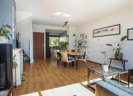 De ruime en lichte woonkamer heeft een neutrale afwerking en er is voldoende ruimte om een gezellige zithoek voor de tv te plaatsen. Dankzij de woningbrede glaspui wordt er veel natuurlijk licht de woonkamer binnen gelaten, wat zorgt voor een heerlijk lichte sfeer. De gestucte wanden in de lichte kleurstelling geven de ruimte een frisse uitstraling en op de vloer ligt een praktische laminaatvloer. Een prima basis om mee voort te borduren op jouw woonwensen!