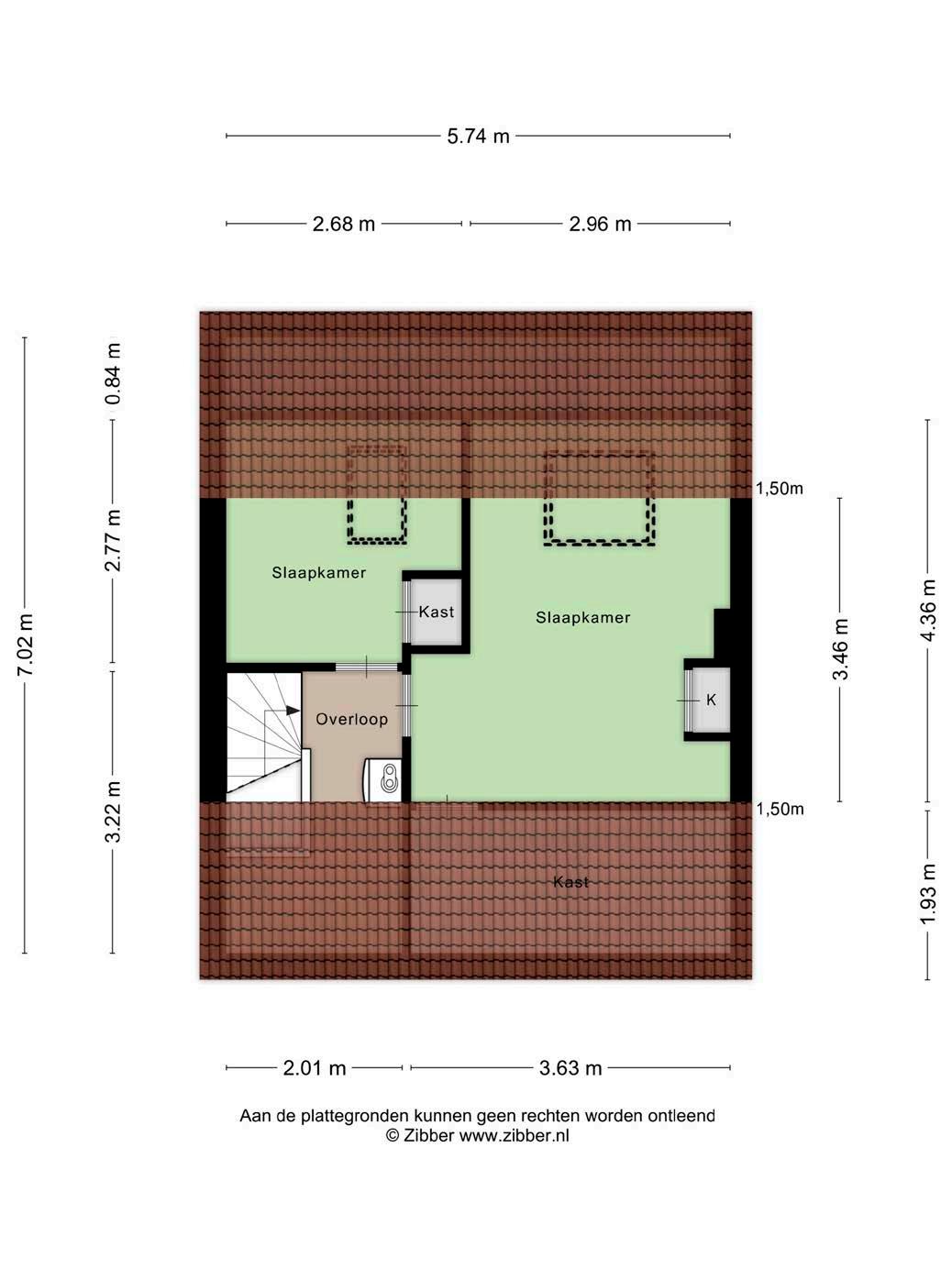 De zolderverdieping is verrassend ruim en beschikt over nog eens twee slaapkamers, beide met dakraam. Op de overloop bevindt zich de cv-ketel.