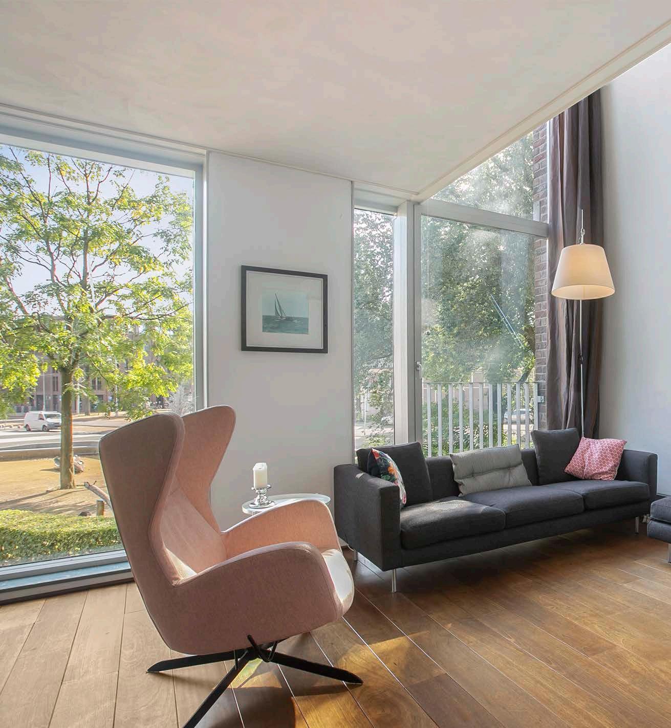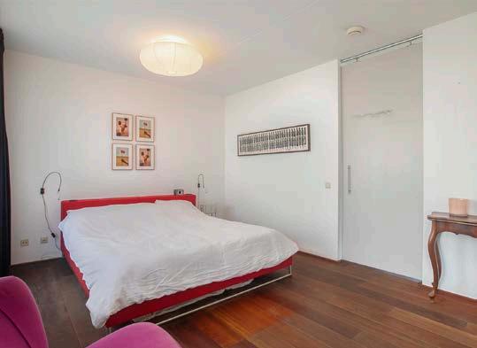 De woonkamer is ruim en heeft een gezellige zithoek. De speelse indeling van het appartement wordt versterkt door de vide, wat voor een unieke uitstraling zorgt. Daarnaast zorgen de grote en hoge raampartijen voor veel lichtinval en een prachtig vrij uitzicht over het Timorplein.