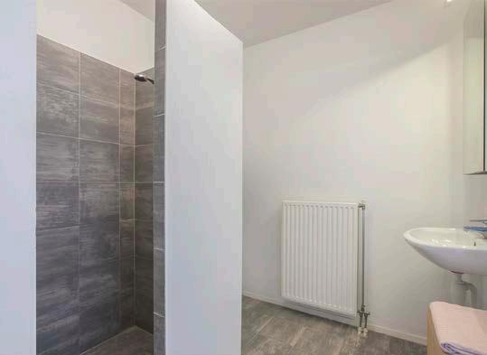 De nette badkamer beschikt over een dubbele douche, wastafel en zwevend toilet.