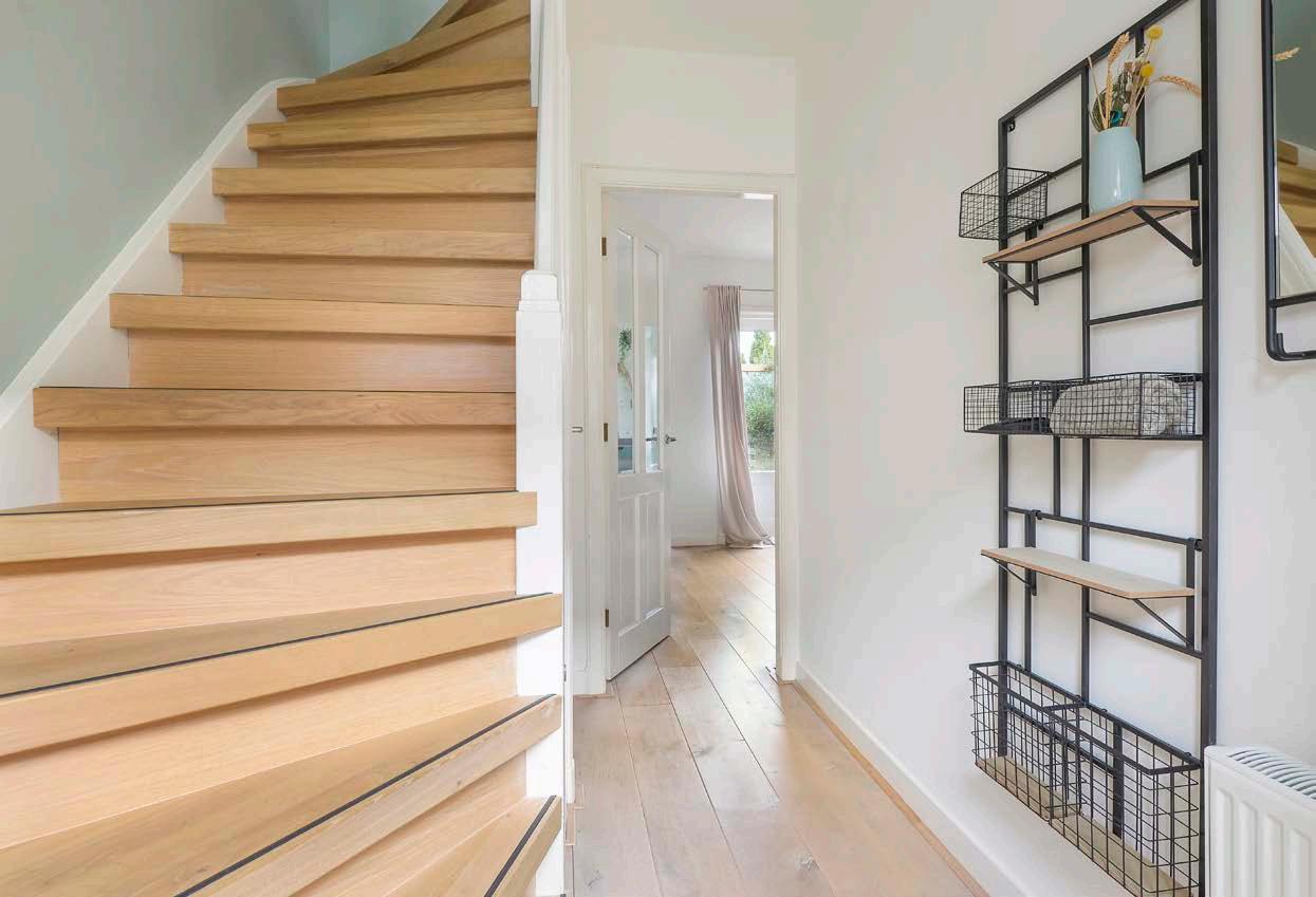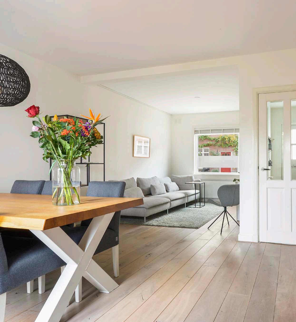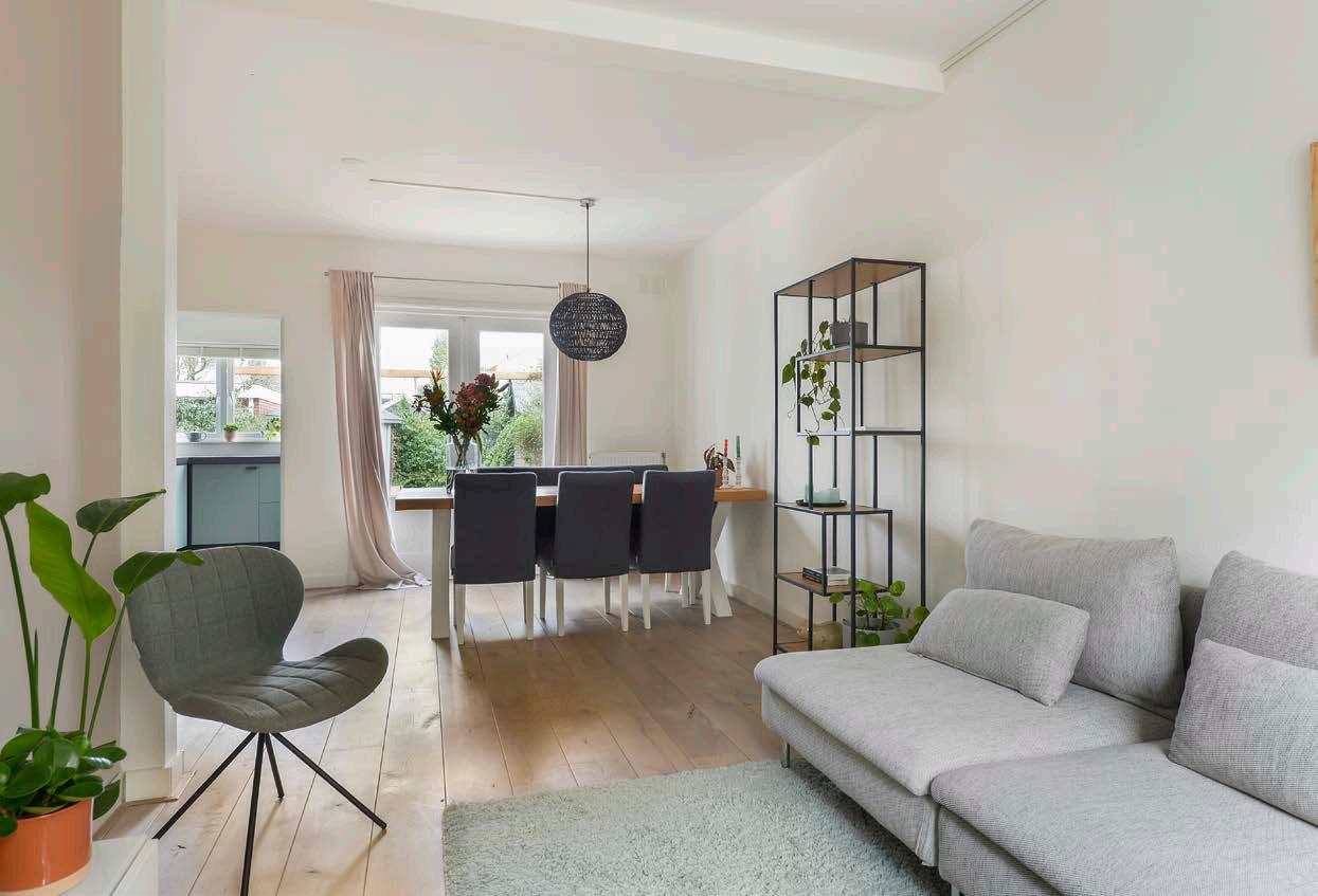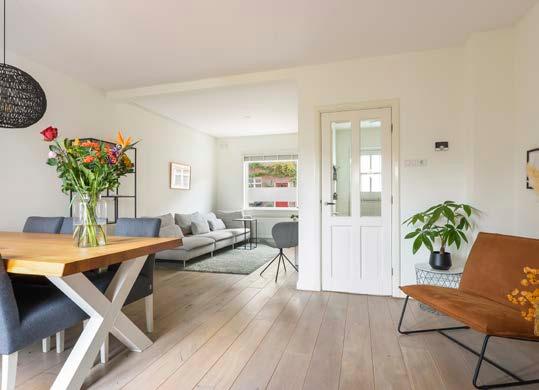 De woonkamer heeft een keurige afwerking met een massief eiken houten vloer en licht gestucte en geschilderde wanden. Een perfecte basis waar jij al leen nog hoeft na te denken over de inrichting. Door de ramen en openslaande deuren naar de ach tertuin valt het daglicht naar binnen en heb je leuk zicht op de woonomgeving. Op zomerse dagen zet je de openslaande deuren open en haal je het mooie weer in huis!