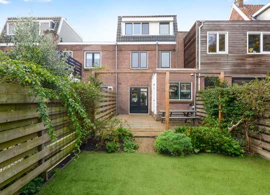 Middels de openslaande deuren stappen we de achtertuin in die is gelegen op het noord-oosten. Door de diepte van de tuin kan je de hele dag tot de avond van de zon genieten. De tuin is aange legd met een mix van bestrating, een gazon en beplanting. Er is voldoende ruimte om meerdere gezellige loungeplekken te creëren waar je heerlijk kunt genieten.