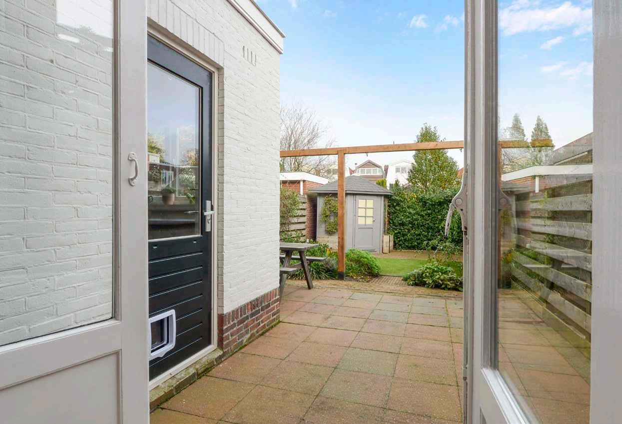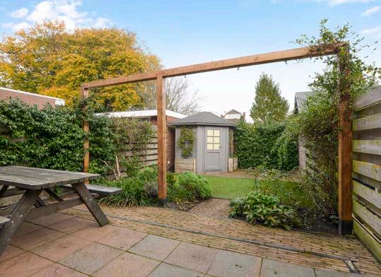 Achter in de tuin staat een vrijstaande houten berging die voldoende plek biedt om je tuingereed schap, tuinkussens en fiets in op te bergen.