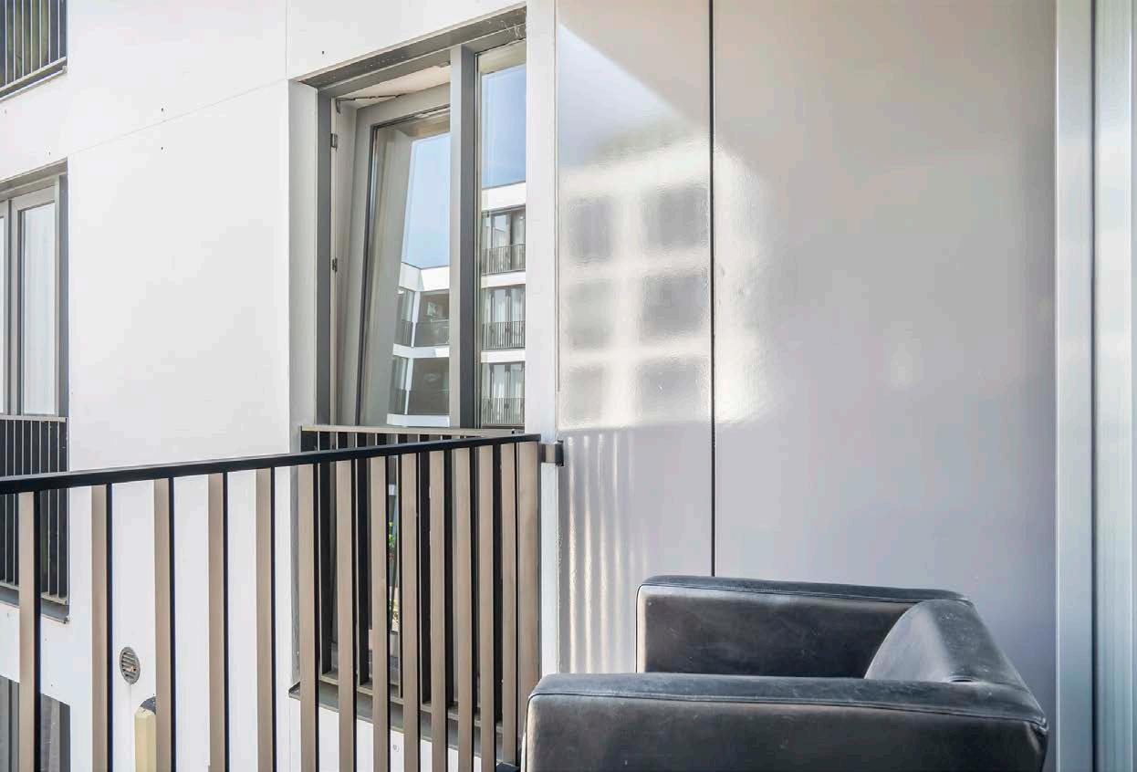 Zowel de slaapkamer als de woonkamer met open keuken oriënteren beide op de zonnige oostkant. Eén en al licht en lucht, met een brede schuifpui vanuit de woonkamer met comfortabel uitgeruste open keuken. Daarnaast heeft de woonkamer óók nog dubbele opendraaiende deuren met zicht op de binnentuin, net als de naastgelegen slaapkamer. Sierlijke Franse balkons laten dit toe. De frisse, drempelloos gelegde houtlaminaatvloer matcht geweldig met de gladde afwerking van de wanden.