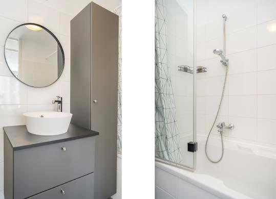 Grenzend aan de slaapkamer bevindt zich de badkamer, verrijkt met een ligbad, met douche en inklapbaar glazen spatscherm, en een fraai opbergmeubel met waskom. Daarnaast is er nog een apart (gasten)toilet met fontein. Beide sanitaire ruimten zijn compleet en comfortabel.