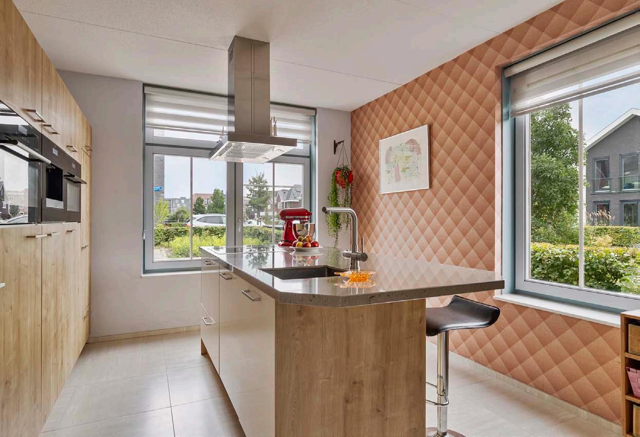 Parkeer je auto op de eigen oprit en betreed de woning. De entree geeft toegang tot de meterkast en een modern afgewerkt toilet. Via een open trap bereik je de eerste verdieping, maar laten we eerst de begane grond verkennen. Aan de rechterzijde bevindt zich een praktische kamer, perfect voor de wasmachine en voorzien van ramen van grond tot plafond die zorgen voor een zee van licht. Hier creeer je gemakkelijk een speelruimte voor de kinderen of een kantoor aan huis. De woonkeuken aan de voorzijde is een droom voor elke kookliefhebber. Met een kookeiland en moderne inbouwapparatuur, waaronder een 4-pits inductiekookplaat, combimagnetron, stoomoven, ingebouwd koffieapparaat, vaatwasser, afzuigkap, koelkast en vriezer, is dit de perfecte plek om culinaire hoogstandjes te creëren. Terwijl je kookt, geniet je van het uitzicht op de rustige straat.