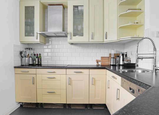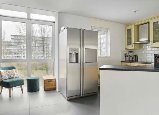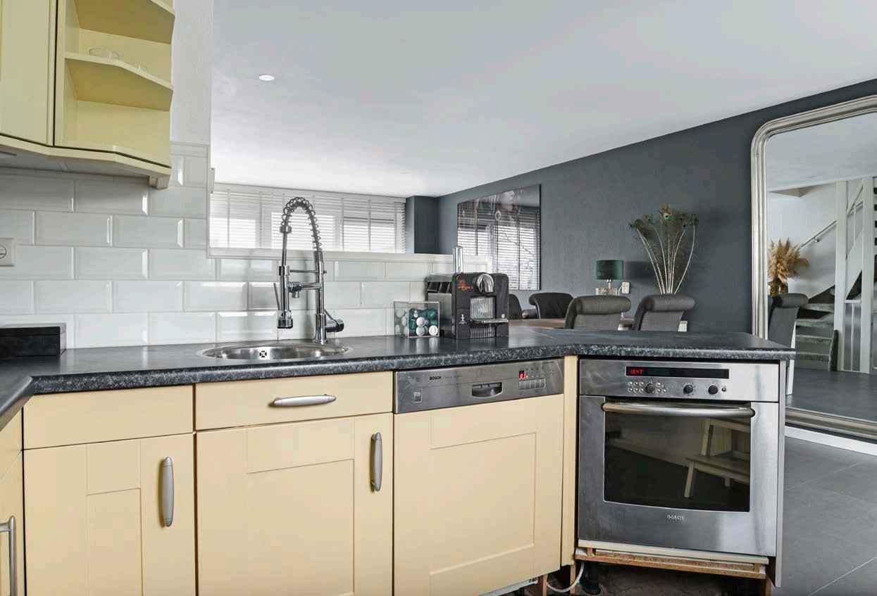 De open keuken sluit naadloos aan op het woonen eetgedeelte; ideaal, want zo blijf je tijdens het koken toch in contact met je gasten. De keuken is geplaatst in een L-opstelling, uitgevoerd in een lichte kleur en voorzien van voldoende werk- en opbergruimte. Uiteraard is er ook gedacht aan de nodige inbouwapparatuur.