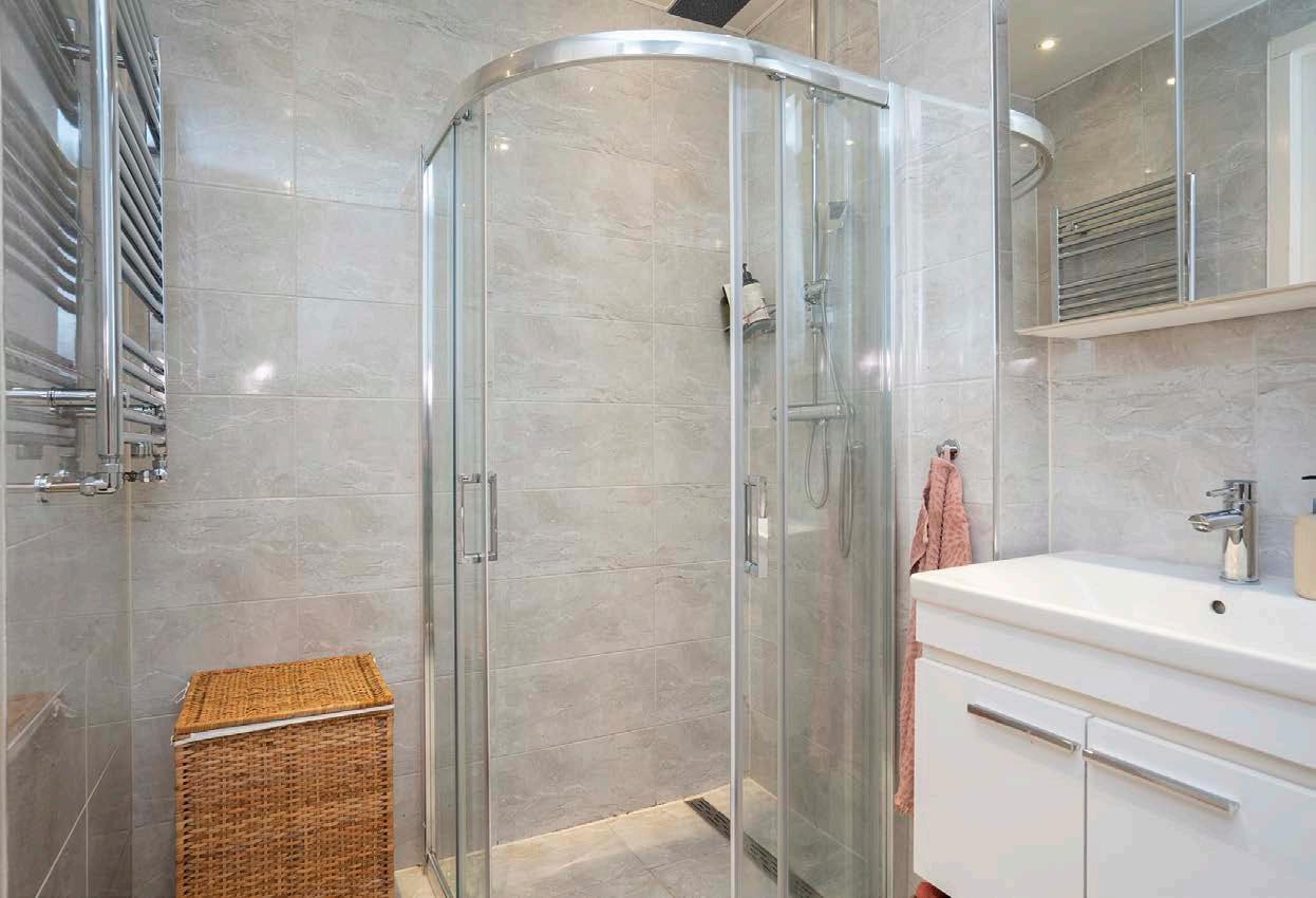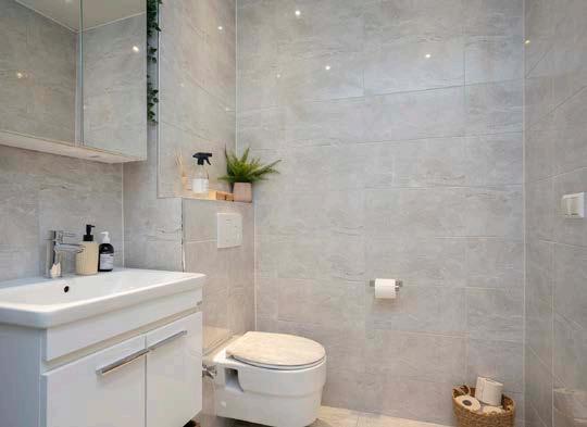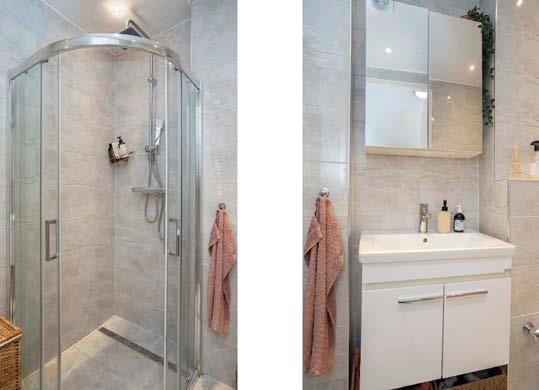 Jezelf opfrissen en klaar maken voor de dag kan in de nette badkamer. De ruimte is volledig betegeld en ingericht met een douche, wastafelmeubel met spiegel en een toilet.
