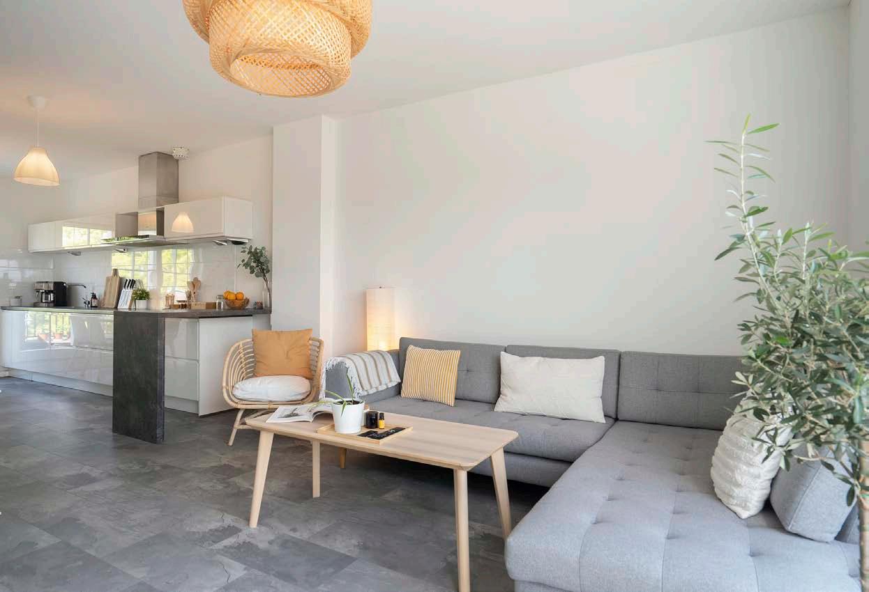 De woonkamer heeft een perfecte basis, waar jij alleen nog de leuke taak hebt om na te denken over de inrichting. Op de vloer liggen grijze tegels en de wanden zijn voorzien van lichte kleuren. Daarnaast valt het daglicht optimaal naar binnen via de schuifpui die eveneens zorgt voor een naadloze verbinding tussen het binnen- en buitenleven.