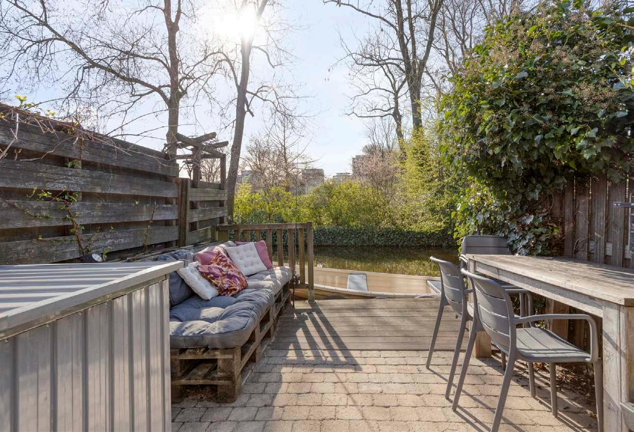 Wat dit huis voor ons echt bijzonder maakt, is de tuin. Hier ervaar je privacy en natuur, midden in de stad. De tuin ligt aan het water en kijkt vrij uit op het Volkspark. Van ’s ochtends tot ’s avonds kun je hier in de zon zitten en van het vroege voorjaar tot laat in oktober leven we eigenlijk buiten. We zitten dan ook vaak tot zonsondergang te tafelen en te borrelen. Ondertussen vliegt er van alles langs en zwemmen de zwaantjes voorbij.