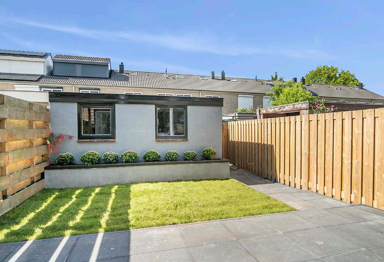 Middels de openslaande deuren komen we in de achtertuin die is gelegen op het westen. De tuin is aangelegd met een mix van betegeling en met gras, en omgeven door een nieuwe schutting. Dit biedt deze tuin de perfecte plek om te ontspannen en te genieten van de zon.