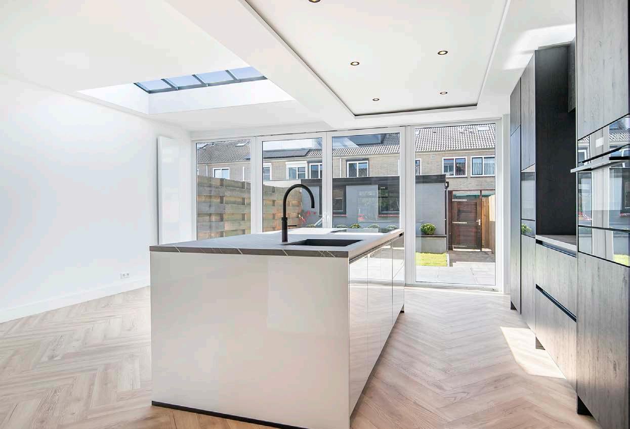 Daarnaast is de woning uitgebouwd aan de tuinzijde. Met aan de tuinzijde een kunststof schuifpui (12’2022). Daardoor is er voldoende ruimte voor een riante eethoek met uitzicht op de tuin. Bij mooi weer kun je de openslaande deuren in de tuin openen en het buitenleven naar binnen brengen.