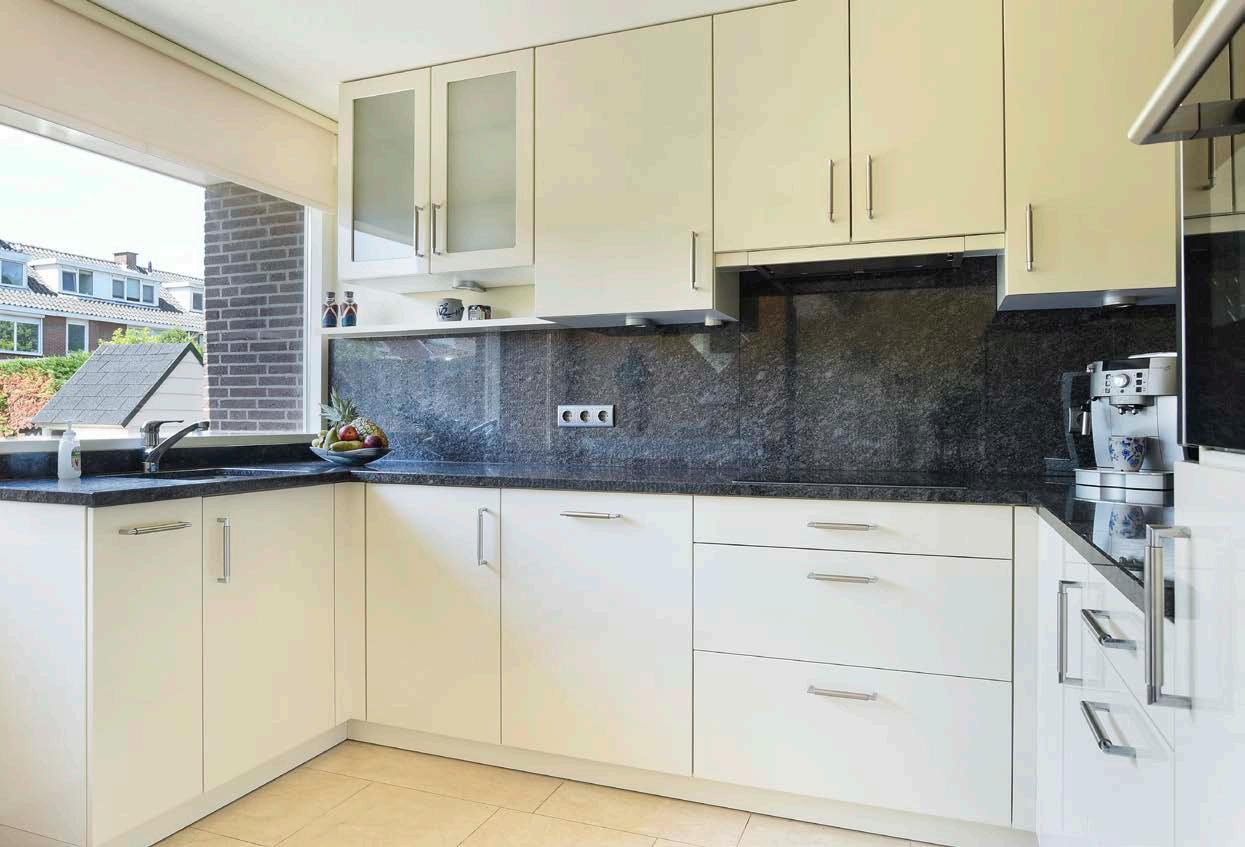 De ruime eetkamer/keuken in de aanbouw aan de achterzijde is dé plek waar je gezellig samen ontbijt, kletst, huiswerk maakt en een kopje thee drinkt. Met dank aan de mooie grote raampartijen strijkt ook hier het daglicht heerlijk neer. De keuken zelf is geplaatst in een L-opstelling waardoor je over veel werk- en opbergruimte beschikt. De keuken is afgewerkt met een granieten werkblad en is voorzien van diverse inbouwapparatuur, zoals een inductiekookplaat, vaatwasser, combi-oven, le mans kast in de hoek en een kleine koelkast. Tot slot is de keuken in crème kleur afgewerkt en ligt er in de keuken een prachtige Travertin tegelvloer.