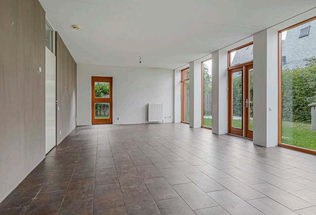 We starten in de woonkamer, daar waar het da gelijkse leven zich vanaf nu grotendeels zal gaan afspelen. De woonkamer is van een groot formaat en dankzij de vele verdiepingshoge ramen rondom en de openslaande deuren naar de tuin, valt het daglicht hier prettig naar binnen. De woonkamer is afgewerkt met lichte kleuren op de wanden en een donkere tegelvloer.