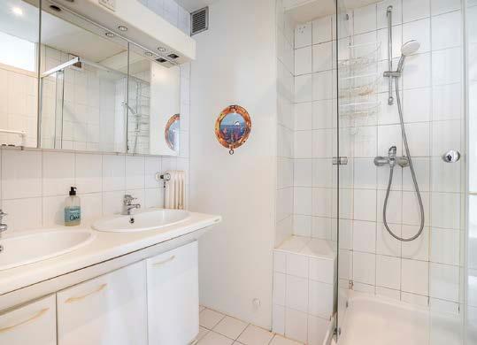 De badkamer is van grond tot plafond betegeld in neutrale kleurstelling en oogt hiermee verzorgd. De ruimte is ingedeeld met een dubbel wastafelmeubel en een douche.