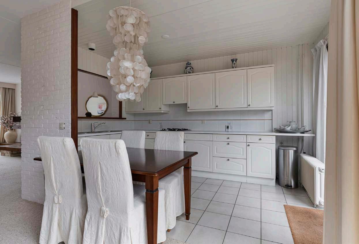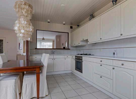 De open keuken in L-vorm is efficiënt ingedeeld en uitgerust met een koelkast/vriezer, gasfornuis en afzuigkap. Een praktische en gezellige plek voor zowel snelle maaltijden als uitgebreide diners.