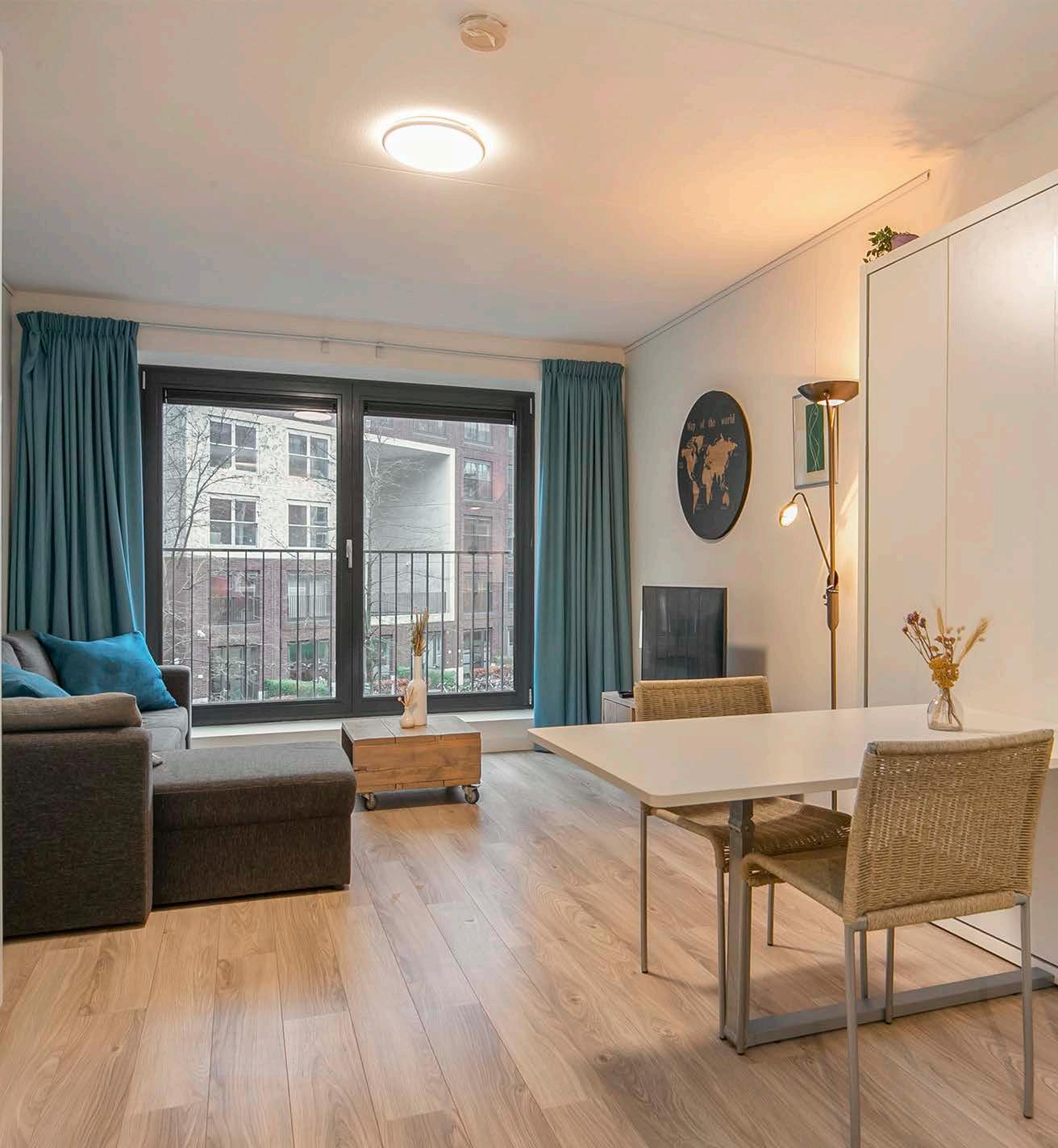 Zonnige studio met balkon. Heel praktisch ingedeeld met comfortabel opklapbed dat tevens dient als (werk)tafel. De grote ramen geven uitzicht op de tuin aan de achterkant van het gebouw.