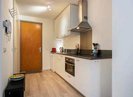 Vervolgens neem je een kijkje in de nette keuken. De keuken is uitgerust met een inductiekookplaat, vaatwasser, koelkast en een combi-oven. De studio beschikt over een handig uitvouwbed met eettafel, deze is ter overname.