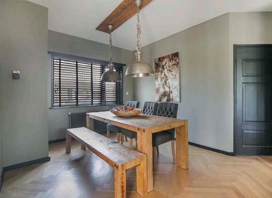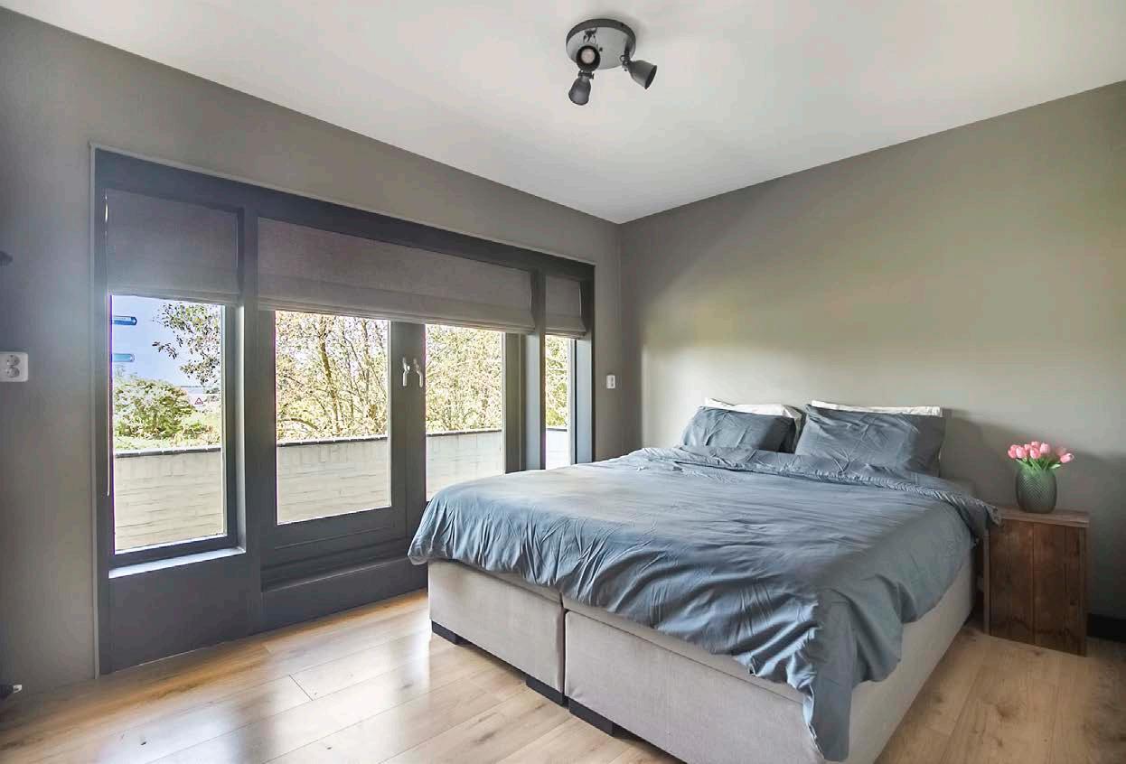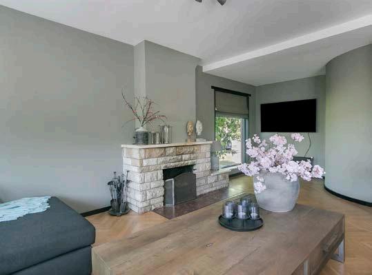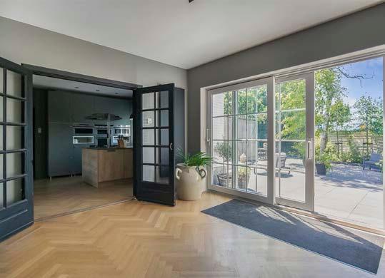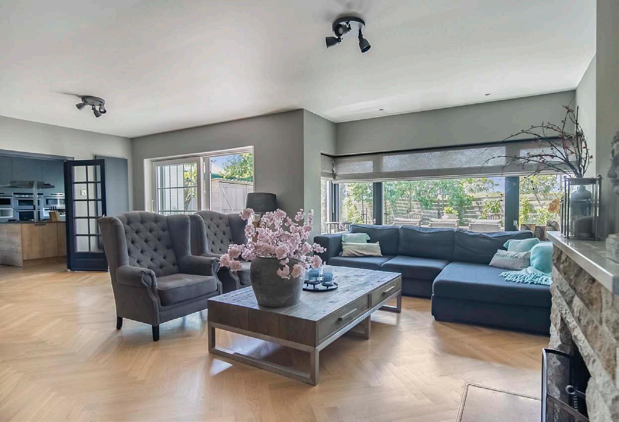 De woonkamer verwelkomt je met zijn overvloedige daglicht, dankzij rondom geplaatste ramen met kunststof kozijnen. De open haard voegt een vleugje gezelligheid toe, terwijl de houten visgraatvloer een elegant tintje geeft aan de ruimte. Vervolgens worden de woonkamer en de keuken met elkaar verbonden door de openslaande tussendeuren en zorgt de glazen schuifpui voor een naadloze verbinding tussen het binnen- en buitenleven.