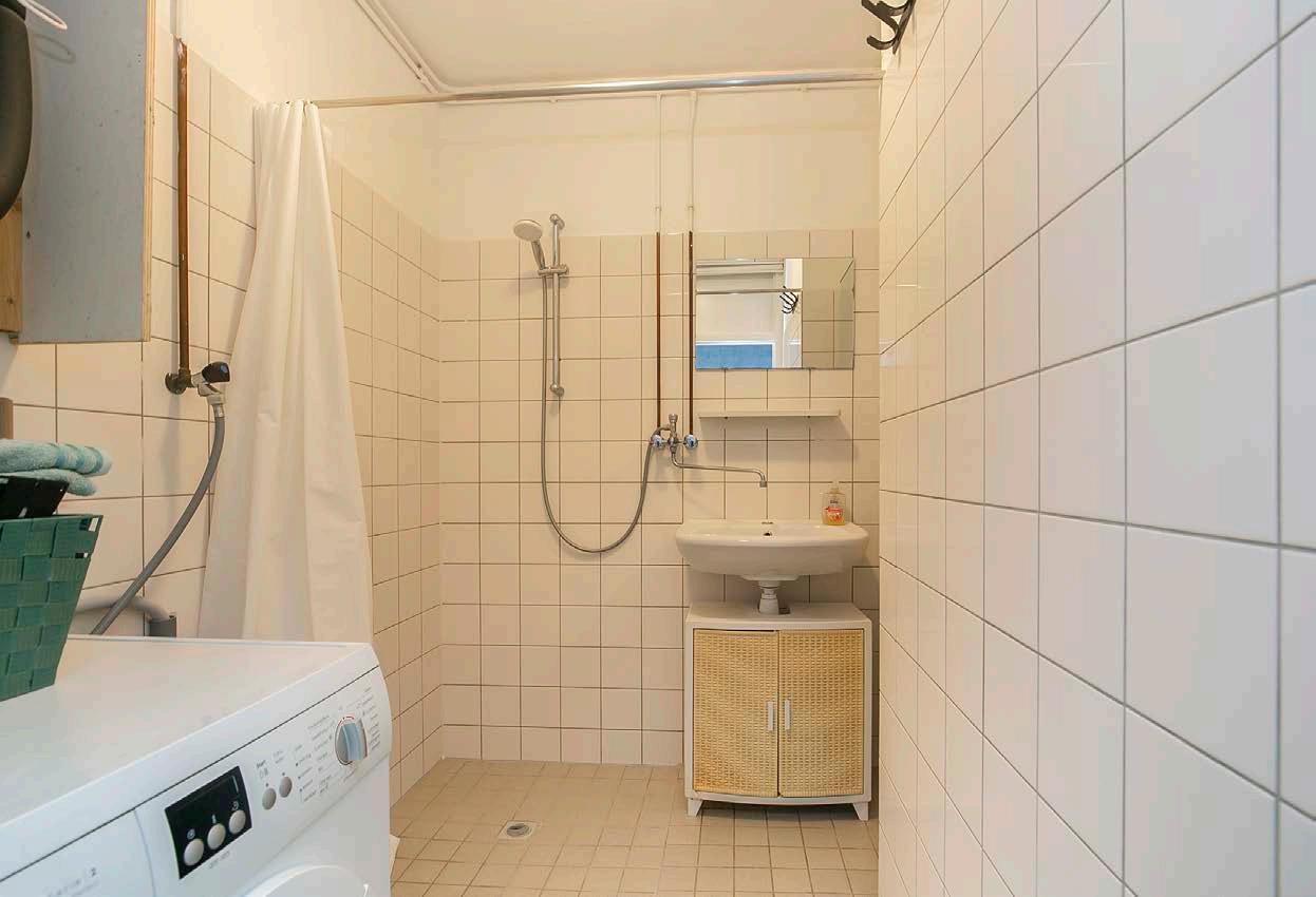 De badkamer is grotendeels betegeld in een lichte kleur en heeft daarmee een verzorgde uitstraling. De indeling bestaat uit een wastafel, douche en de wasmachineaansluiting.