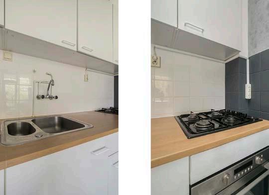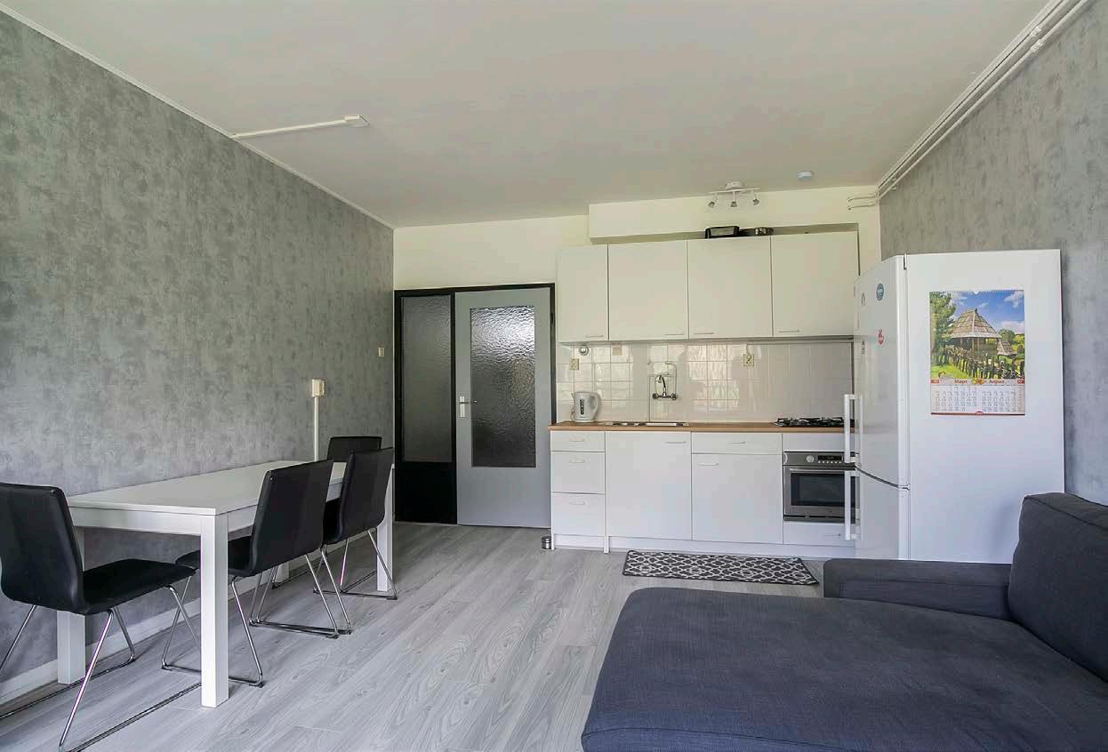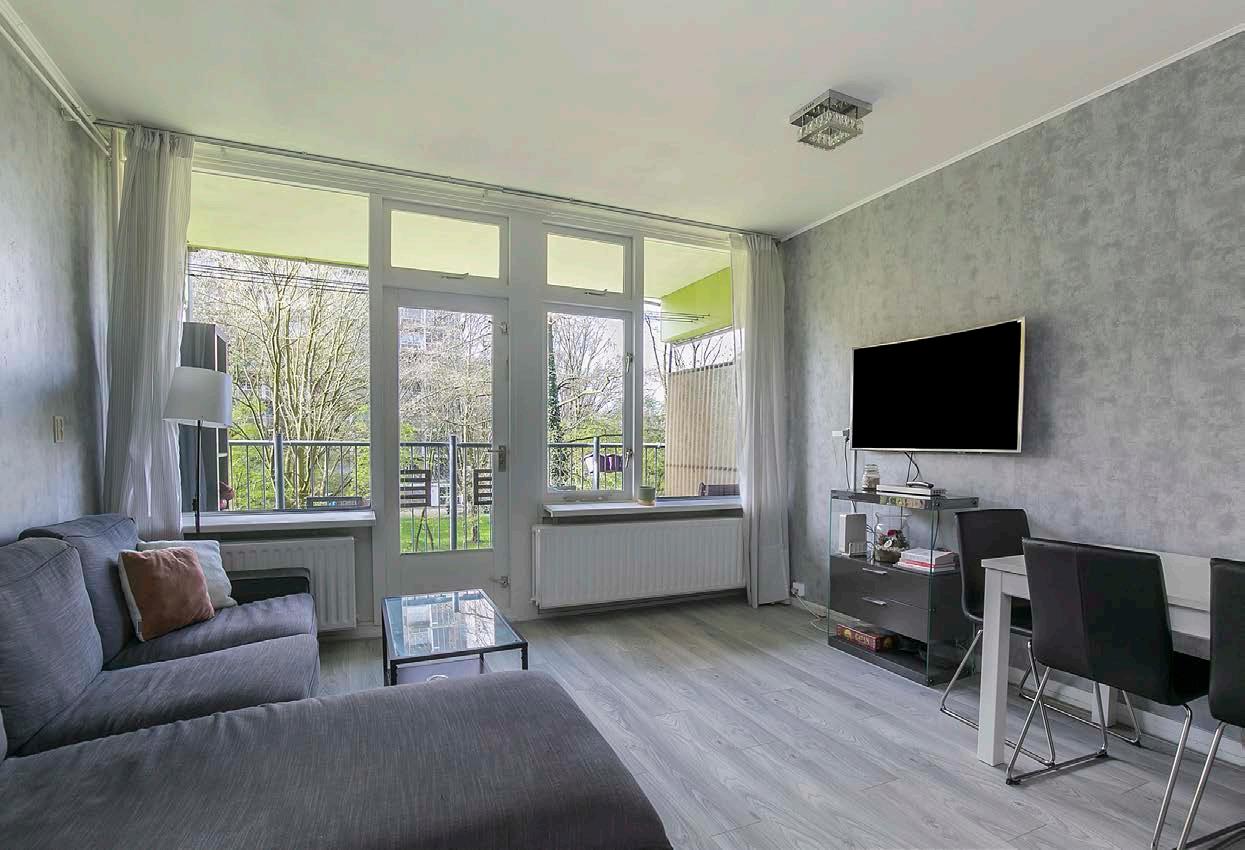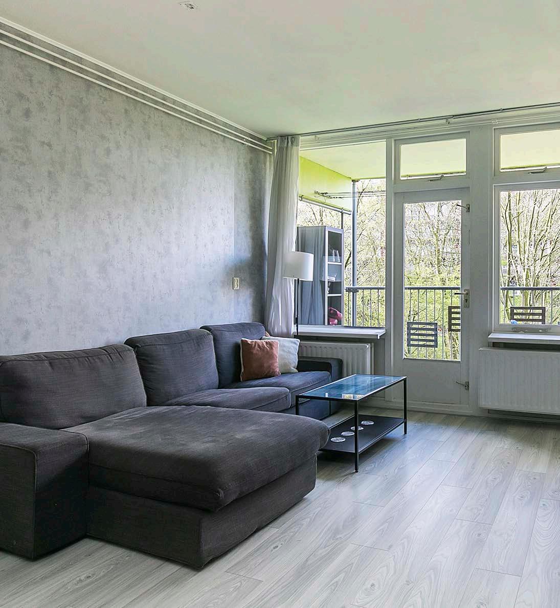 Vanuit de hal kom je direct in de woonkamer. Dankzij de grote ramen en de deur naar het balkon komt er een fijne hoeveelheid daglicht naar binnen. Daarnaast is het geheel netjes afgewerkt met behang op de wanden en een laminaatvloer waardoor je hier al snel de verhuisdozen uit kunt pakken.