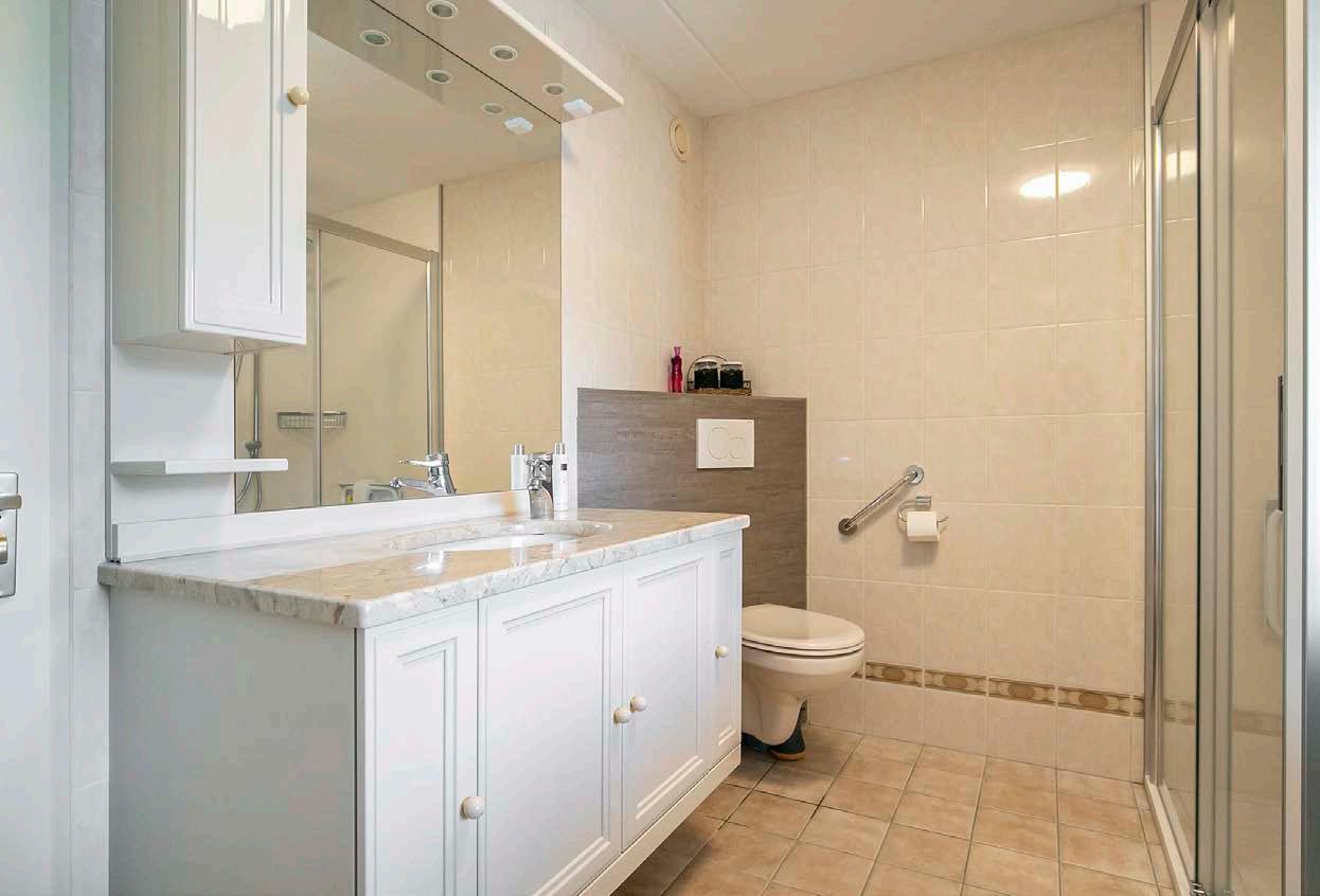De badkamer op deze verdieping is een heerlijke plek om de dag fris en fruitig te beginnen. Het geheel is van grond tot plafond betegeld en heeft daarmee een verzorgde uitstraling. De indeling bestaat uit een inloopdouche, de witgoedaansluitingen en een wastafelmeubel.