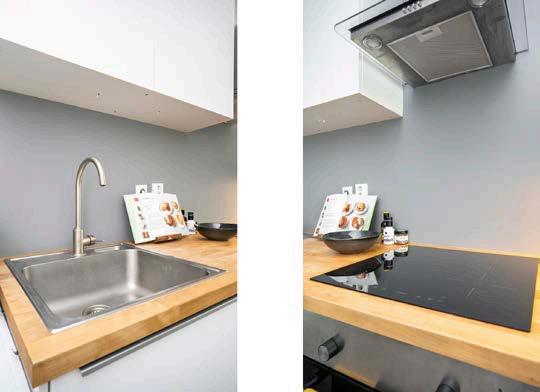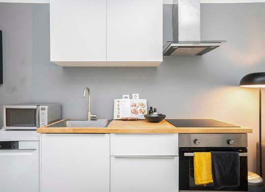De open keuken sluit met zijn moderne uiterlijk eenvoudig aan op verschillende interieurstijlen. Uiteraard is er ook aan kookcomfort gedacht; het geheel is uitgerust met een 4 zones inductiekookplaat, afzuigkap, oven, vrijstaande magnetron, vrijstaande vaatwasmachine en een vrijstaande tafelkoelkast.