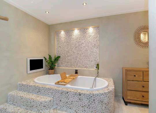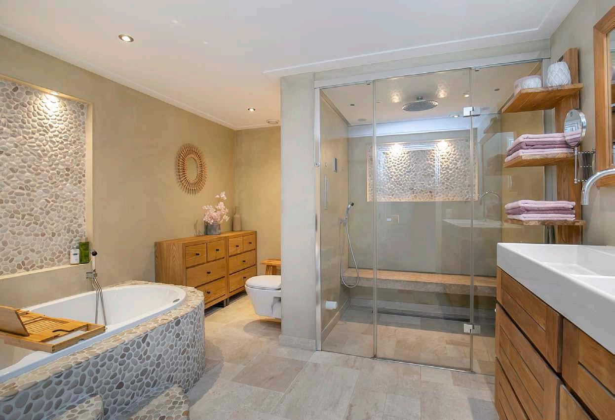 In de luxueuze badkamer, op de eerste verdieping, zal het je aan niets ontbreken! De betegeling is prachtig en ook hier geniet je van vloerverwarming. Daarnaast kun je optimaal relaxen in het ligbad met whirlpool en een ingebouwde tv. En de dag fris en fruitig starten kan in de stoomdouche-cabine met rainshower en zitgedeelte. Tot slot is de ruimte nog compleet ingericht met een wastafelmeubel met dubbele wastafel, wandcloset en een urinoir.