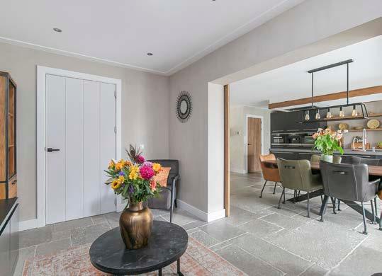 Zodra je de voordeur opent, word je begroet door een prachtige hal met een fraaie stenen vloer. De gehele begane grond is voorzien van vloerverwarming, wat zorgt voor extra comfort. Hang je jas op en vervolg je weg vanuit hier naar de woonkamer, toiletruimte, kelder, garderobe of de trap naar de eerste verdieping.