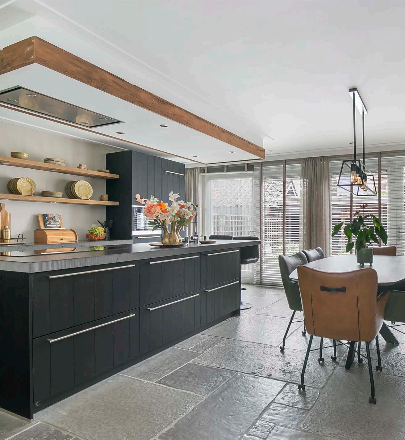 De luxe keuken met kookeiland is een droom voor elke kookliefhebber, compleet met een zwart ontwerp en een hardstenen blad met gefrijnde rand. Hier vind je een inductiekookplaat met 5 zones, een afzuigkap, een vaatwasmachine, een Quooker, een Miele wijnkoelkast, een Miele stoomoven, een Miele combi oven/magnetron, een Miele koffiemachine, een koelkast/vriezer en een royaal aantal kasten en laden.