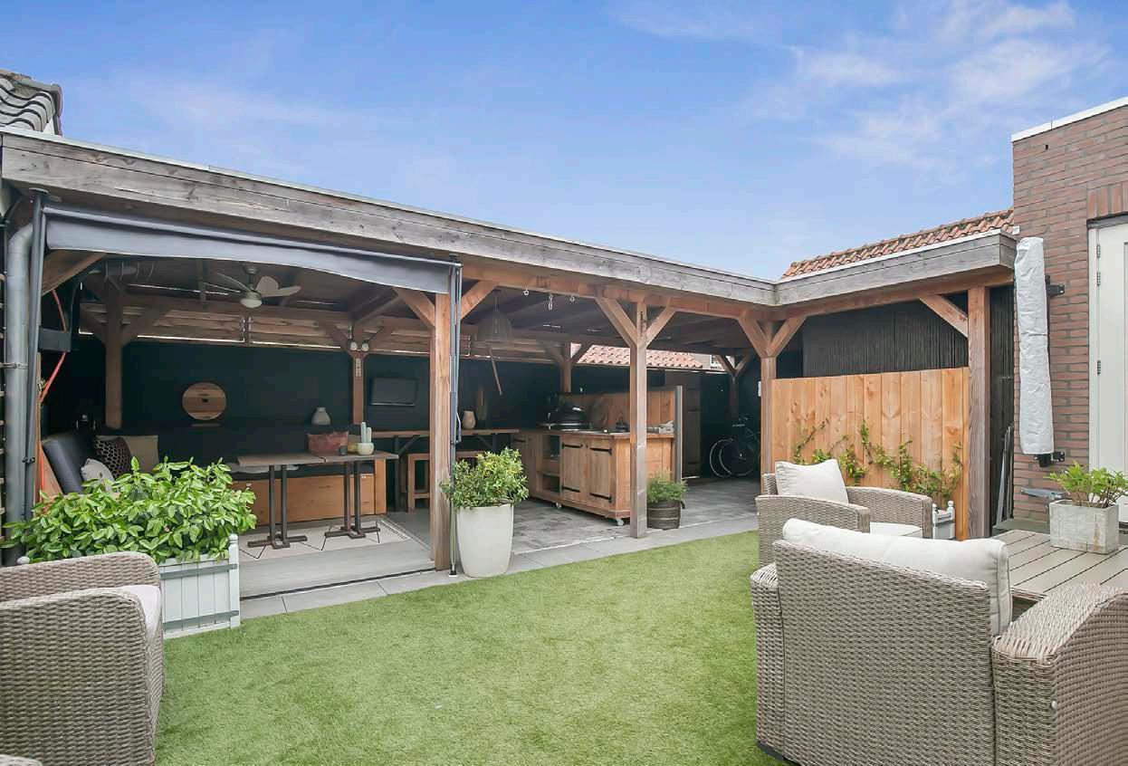 Het hoogtepunt van de tuin is ongetwijfeld de gezellige veranda met buitenkeuken. Hier kun je heerlijk loungen, ontspannen met een goed boek of genieten van gezellige momenten met vrienden en familie. De veranda is de perfecte plek om te koken en buiten te dineren, zelfs als het weer even niet meezit. Dankzij de buitenkeuken heb je alles binnen handbereik om culinaire meesterwerken te creëren en je gasten te verrassen.